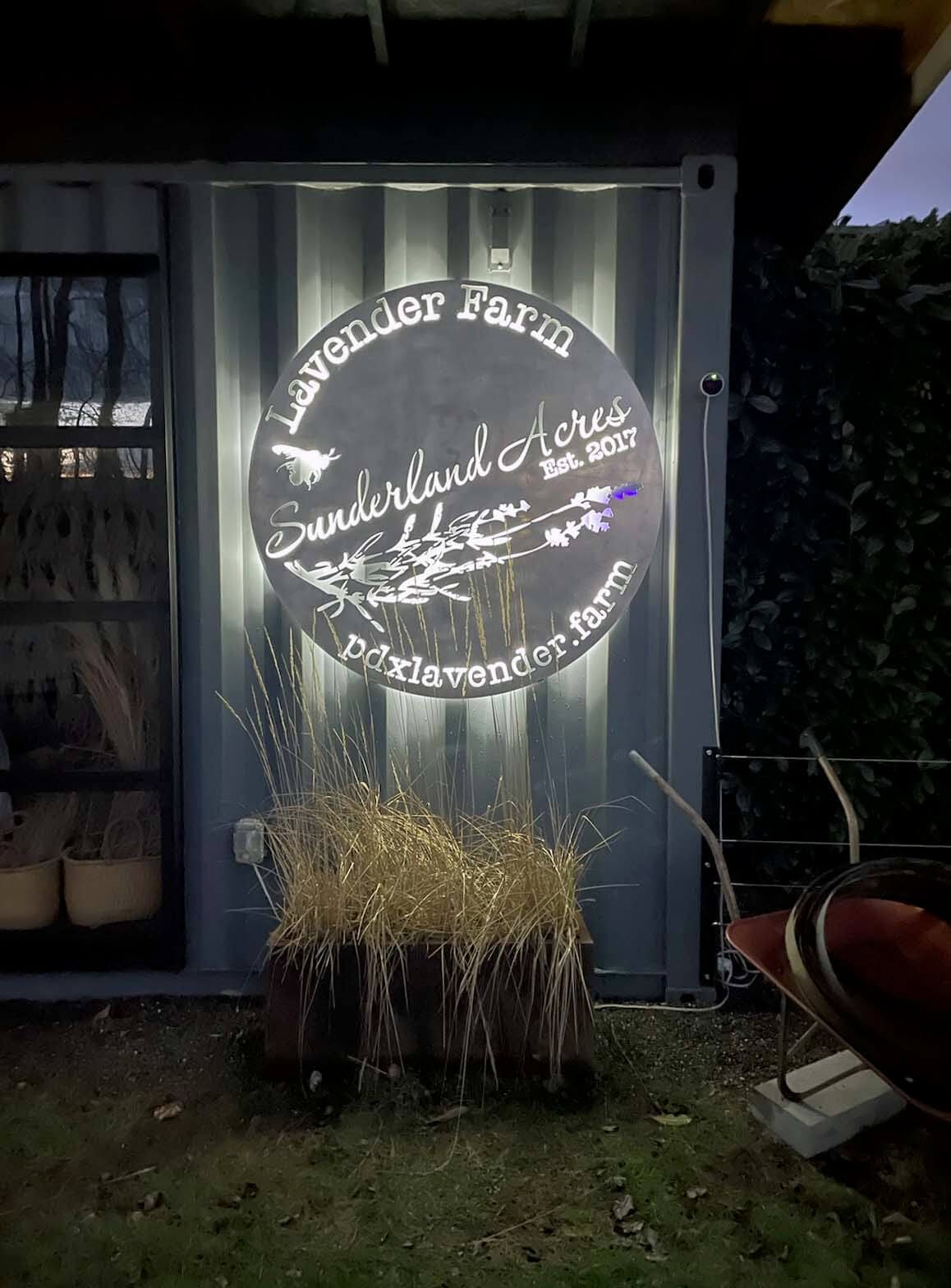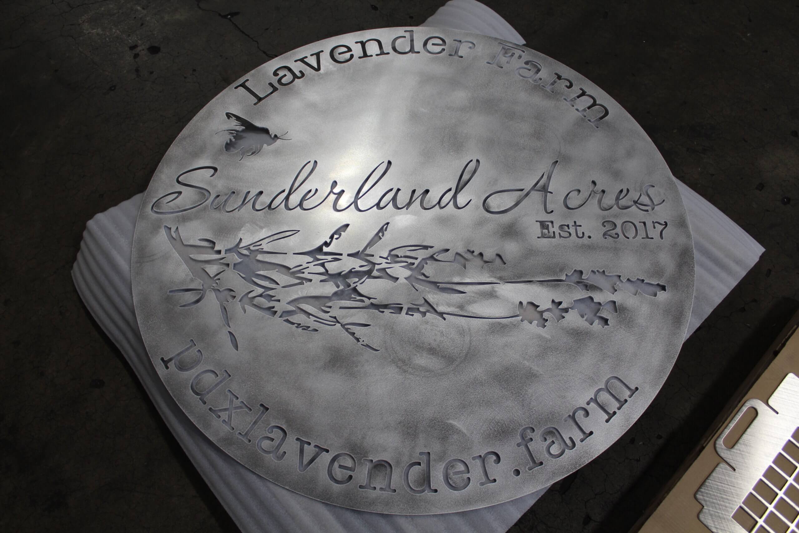 Profile Laser skillfully transformed Ramona’s designs into three remarkable signs, each crafted with precision and attention to detail. The centerpiece is a magnificent 54.5″ diameter sign placed prominently in front of the lavender production area, captivating visitors and inviting them into Sunderland Acres’ world. Additionally, two smaller signs, measuring 24.652″ in diameter, grace different corners of the farm, ensuring every visitor encounters the beauty and charm of Sunderland Acres.