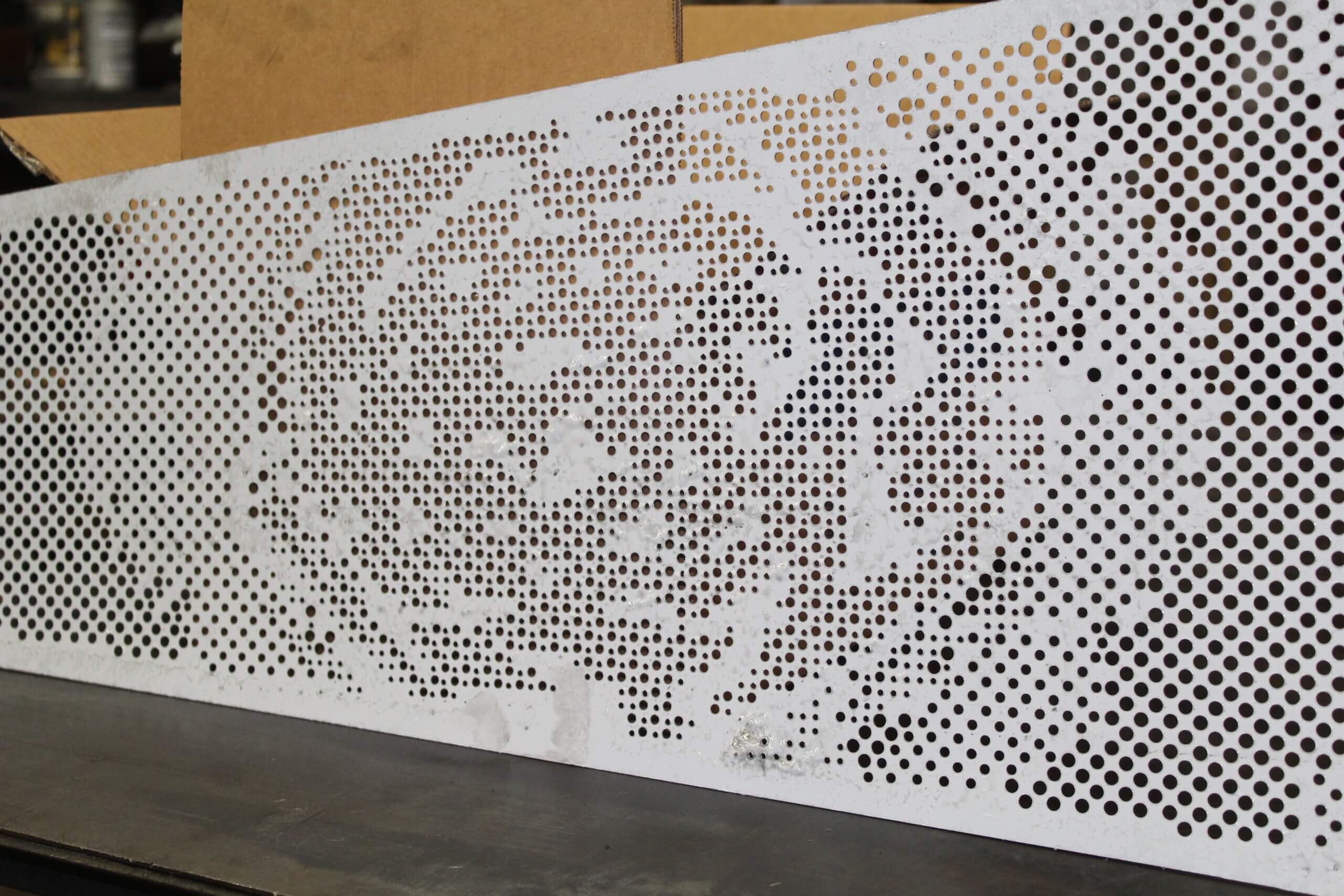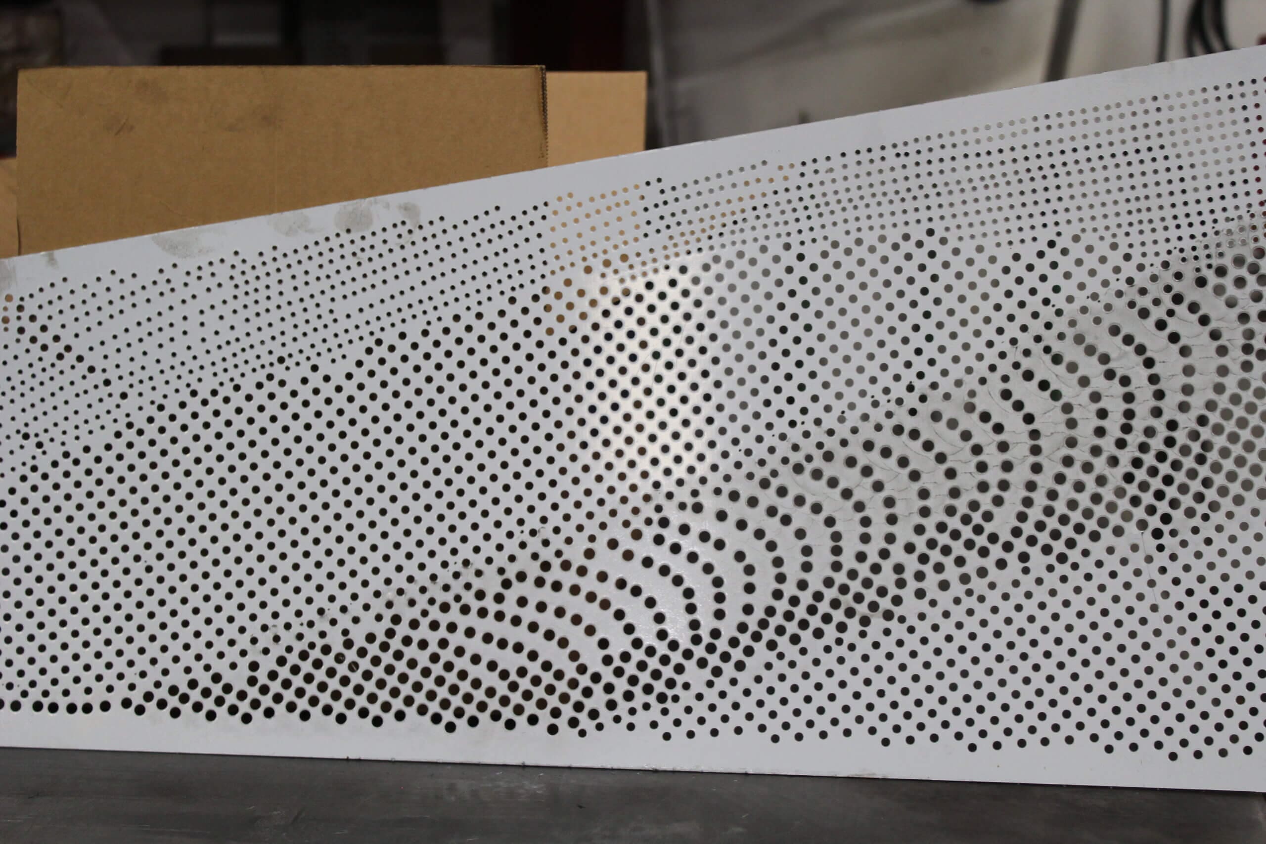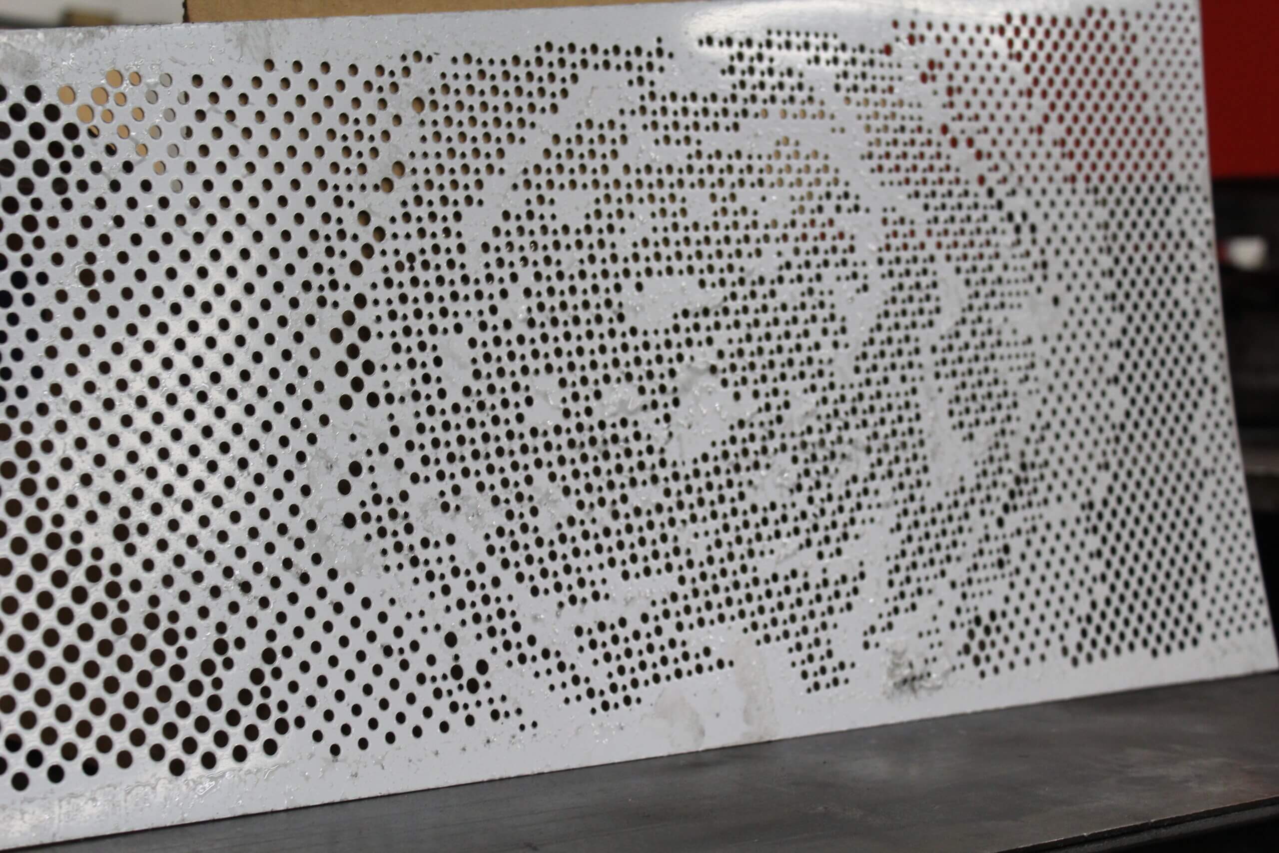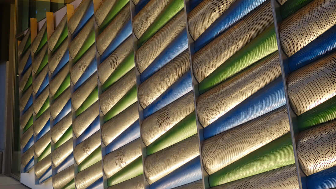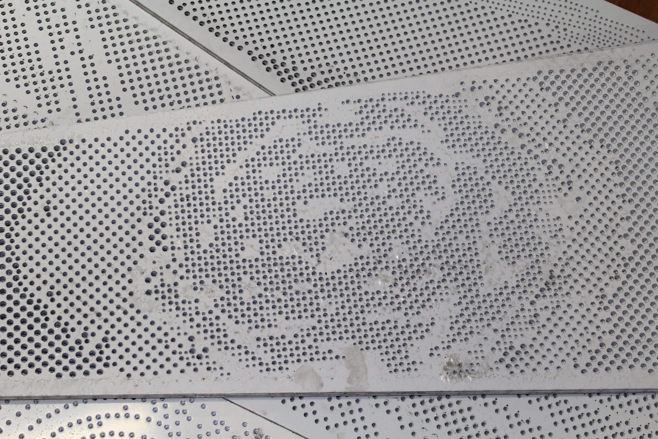 Roy Manufacturing used the Amada Coma 588 to punch multiple-size round holes with different centers in 16 GA SS 304-2B material to create four unique patterns for the wall pieces. The work was installed by Jim Schmidt, Art and Design Works, LLC (jimartanddesign@gmail.com).