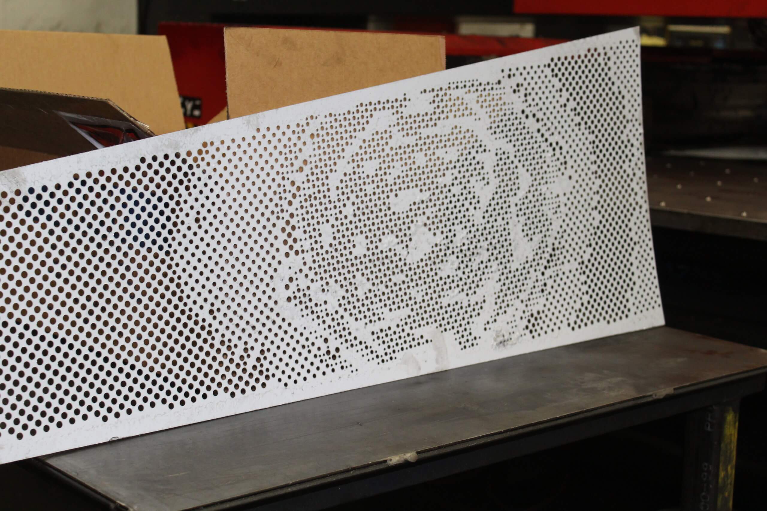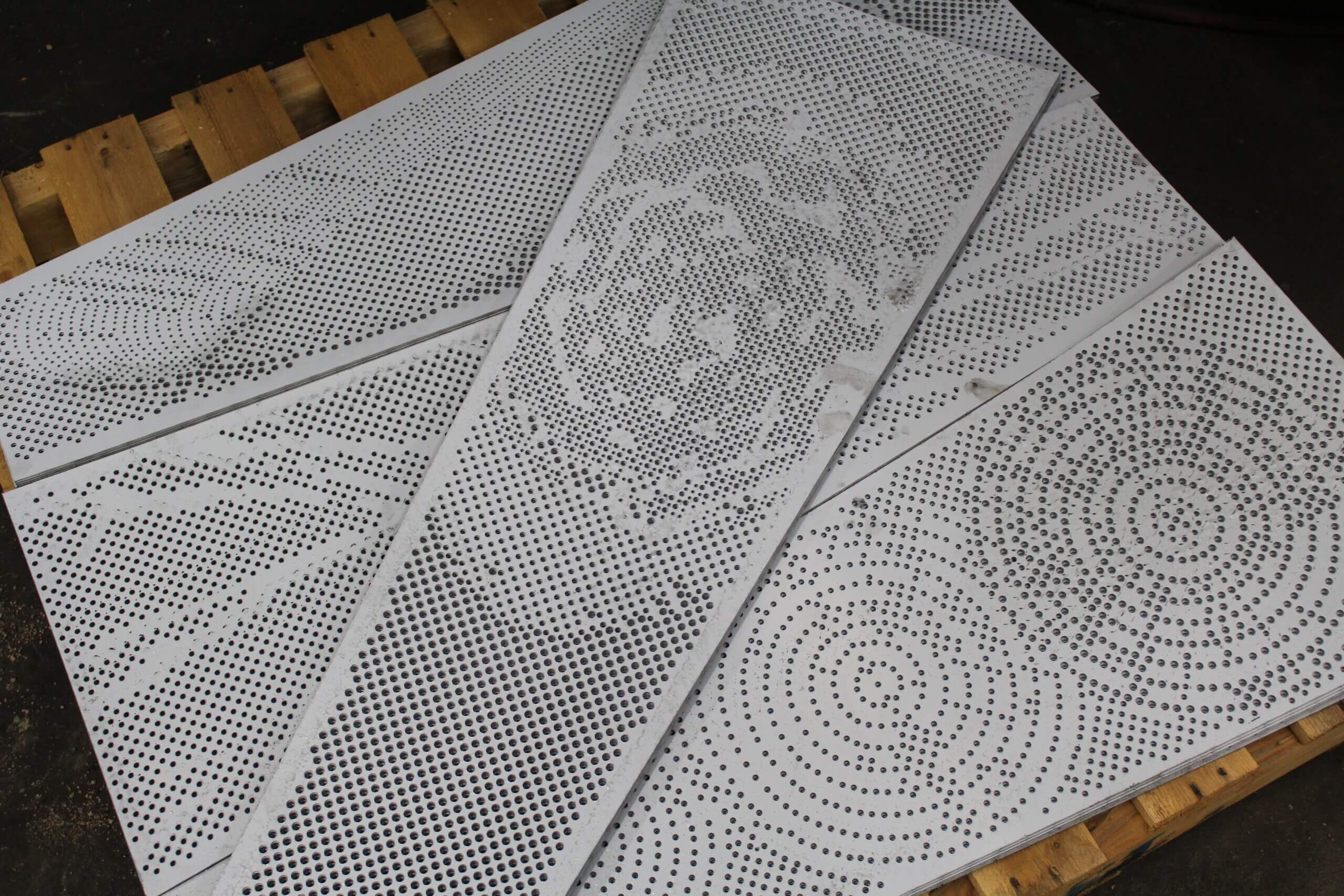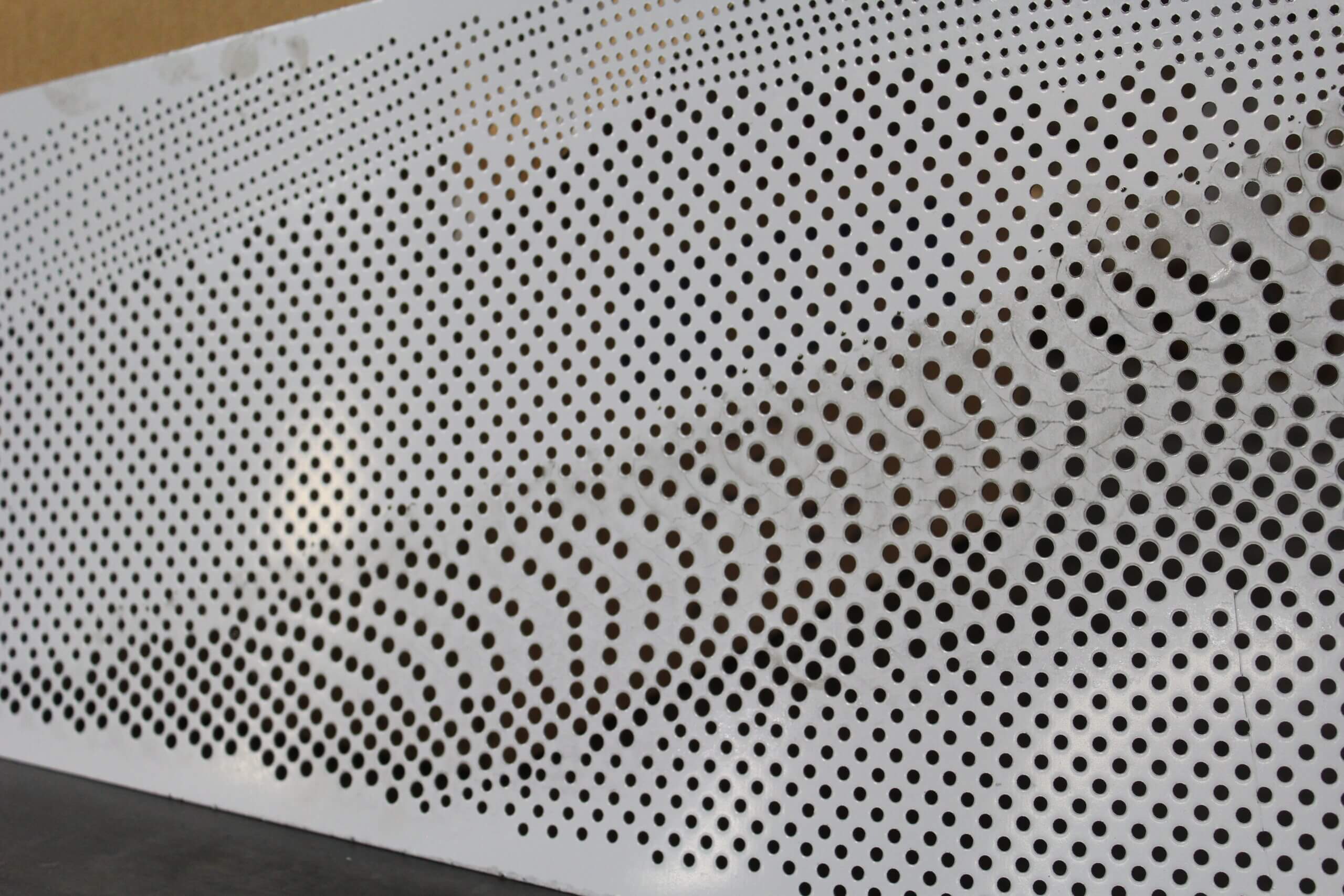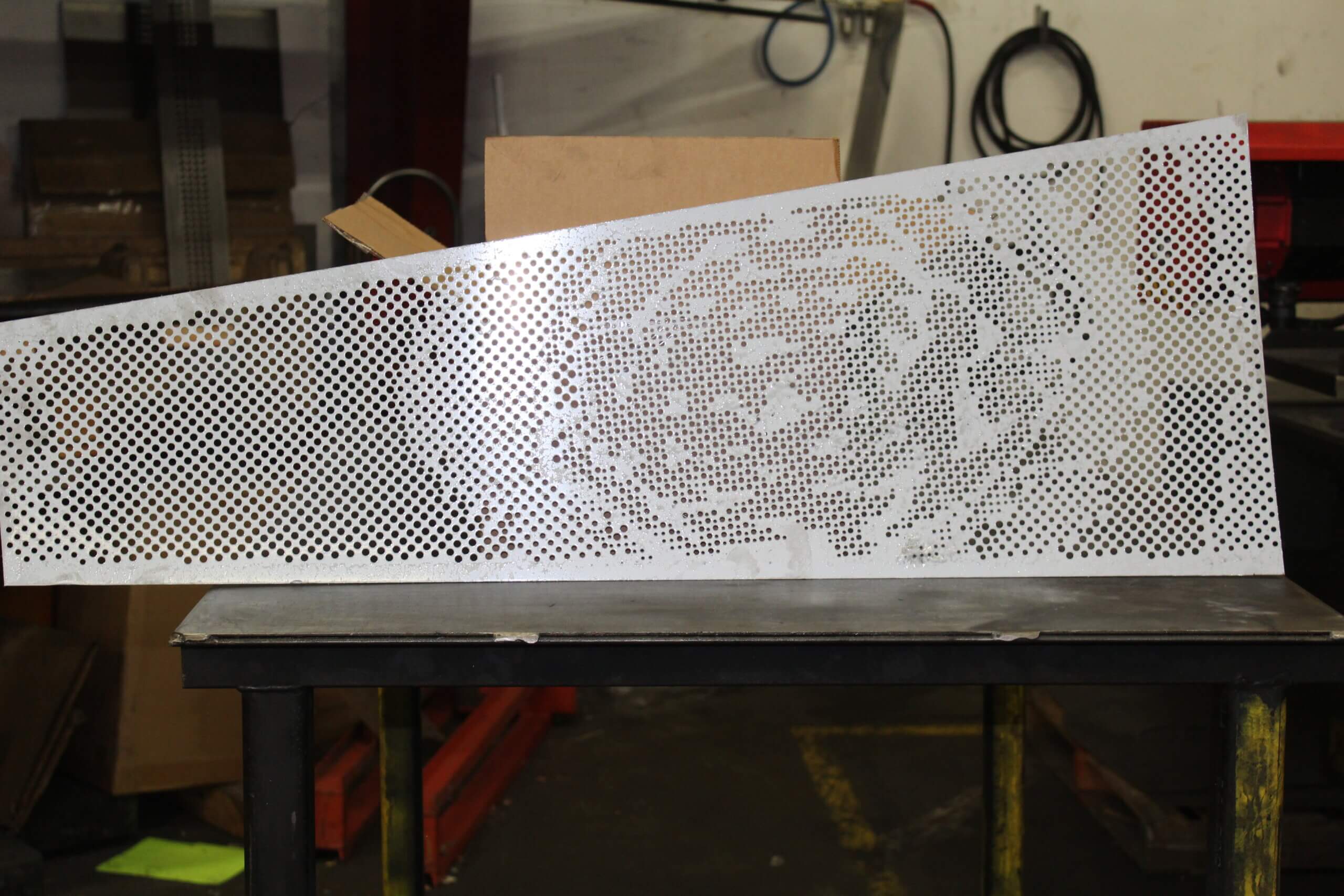Roy Manufacturing used the Amada Coma 588 to punch multiple-size round holes with different centers in 16 GA SS 304-2B material to create four unique patterns for the wall pieces. The work was installed by Jim Schmidt, Art and Design Works, LLC (jimartanddesign@gmail.com).
