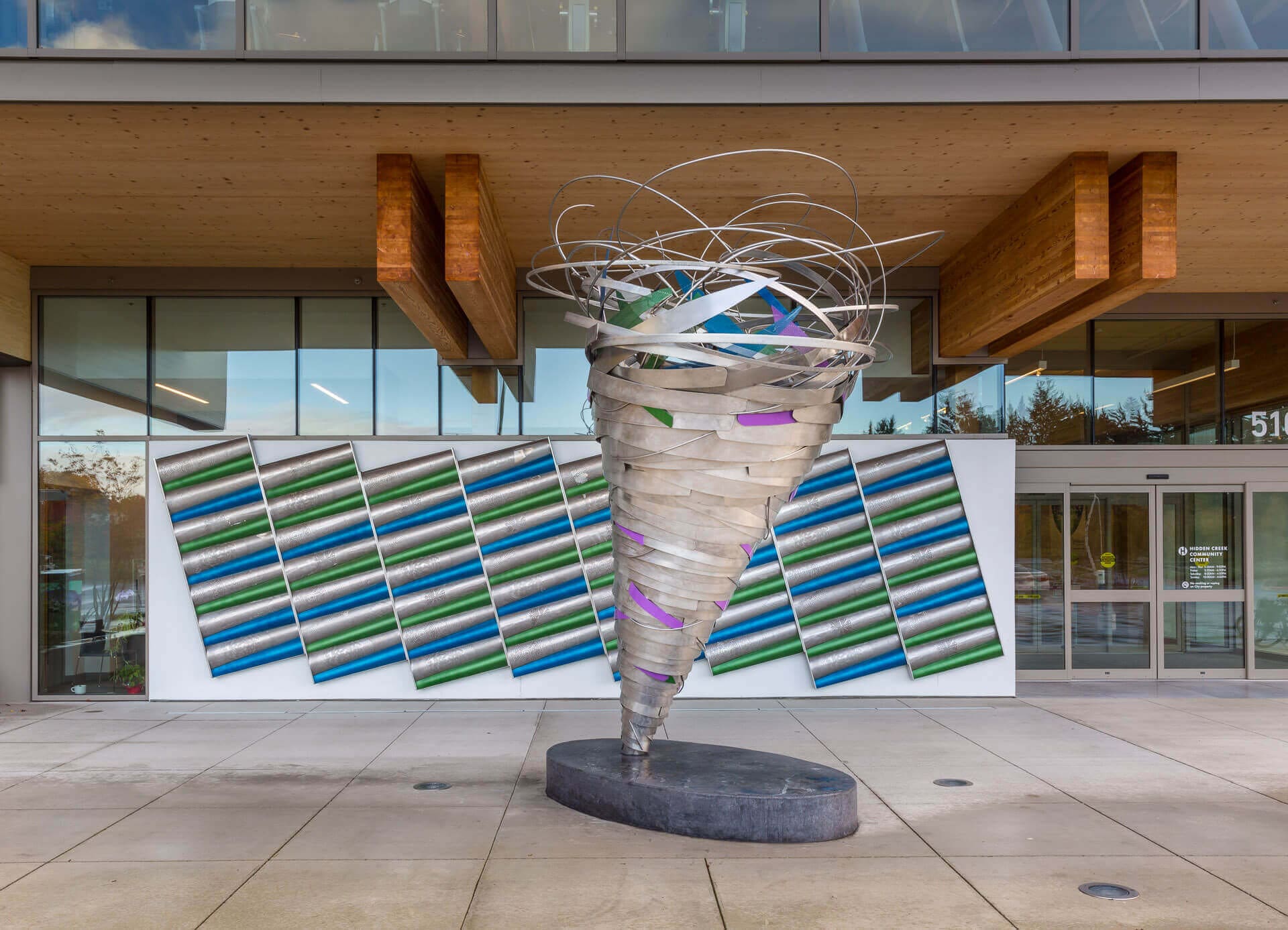 Hillsboro, Oregon, is a vibrant and growing city that boasts a rich cultural and artistic heritage. Artwork plays a crucial role in the city’s identity and has contributed to its reputation as a destination for tourists and art enthusiasts alike. From public murals and sculptures to galleries and events, Hillsboro’s art scene is one of its most valuable assets. In Hillsboro, the artistic community has created a shared cultural experience accessible to everyone. From children to adults, art has something to offer everyone. Public murals and sculptures can be enjoyed by anyone passing by, while galleries and events provide an opportunity for a deeper engagement with the art and artists. One such artwork commissioned by the City of Hillsboro welcomes visitors to the front entrance of the Hidden Creek Community Center.
