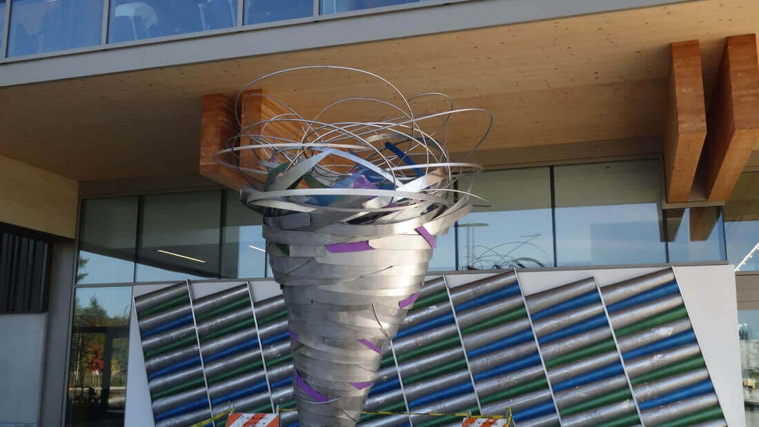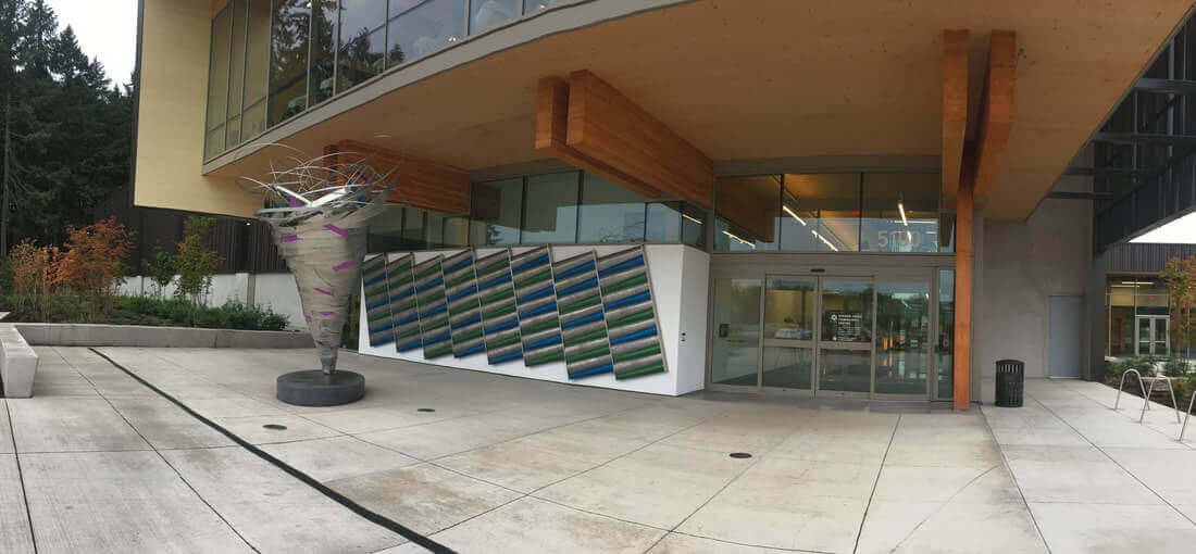 Located at the Hidden Creek Community Center in Hillsboro, Oregon, Norie Sato’s artwork is a captivating integration of spirit, movement, energy flow, community, individuality, nature, and memory. The artwork comprises two distinct parts: a wall piece and a sculpture, each comprised of more minor elements that come together to create a cohesive whole. Norie’s artwork uniquely reflects the landscape and site, as well as the community members who utilize the facility. The sculpture is a dynamic force that expresses the collective energy of the community, drawing them into the center. In contrast, the wall represents a quieter gathering of energy “collected” from the sculpture and transformed into a more orderly and organized community. The artwork’s intricate interplay of dynamic and static elements creates a cohesive and dynamic representation of the Hidden Creek Community Center, reflecting the collective spirit of the people who use and enjoy it.