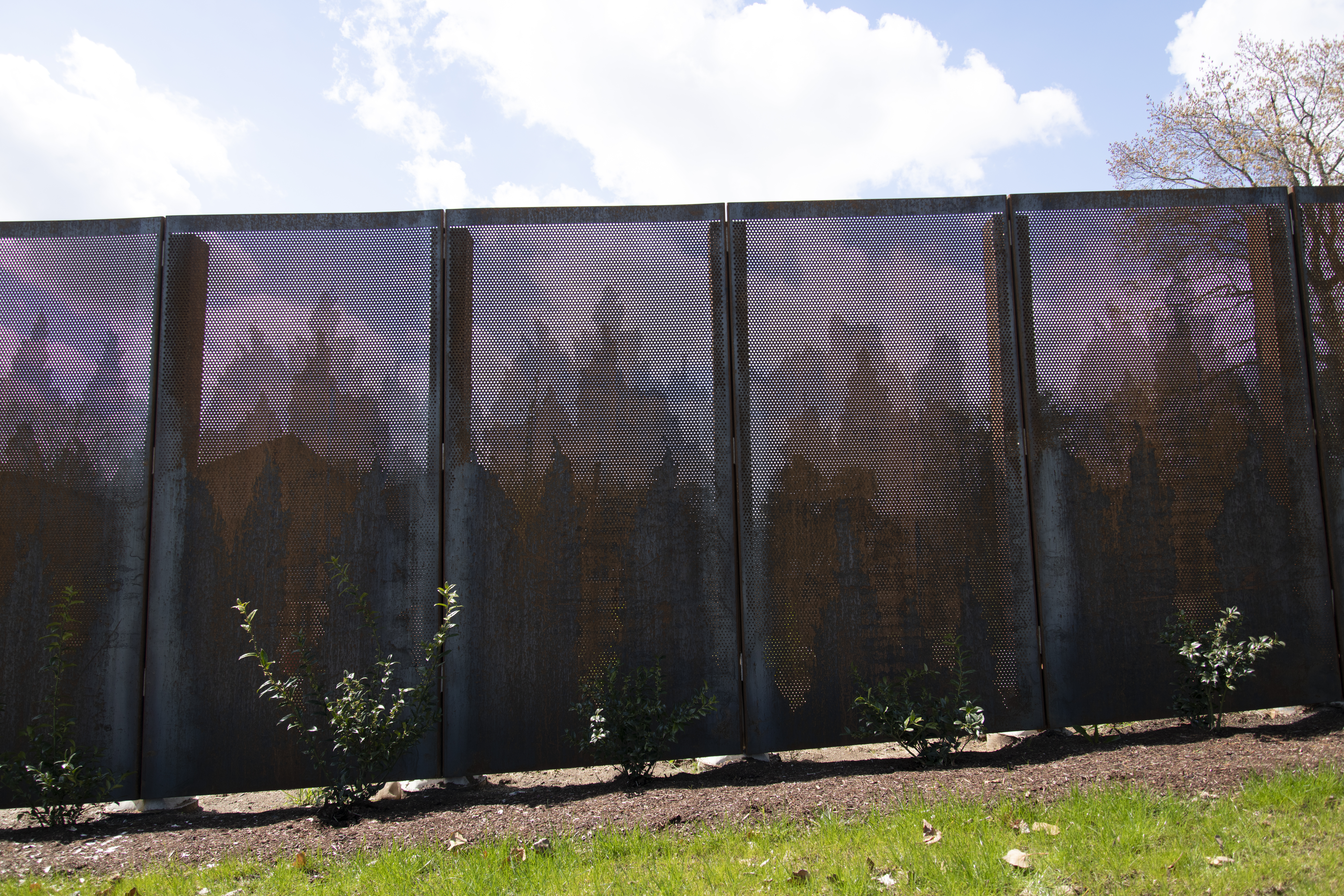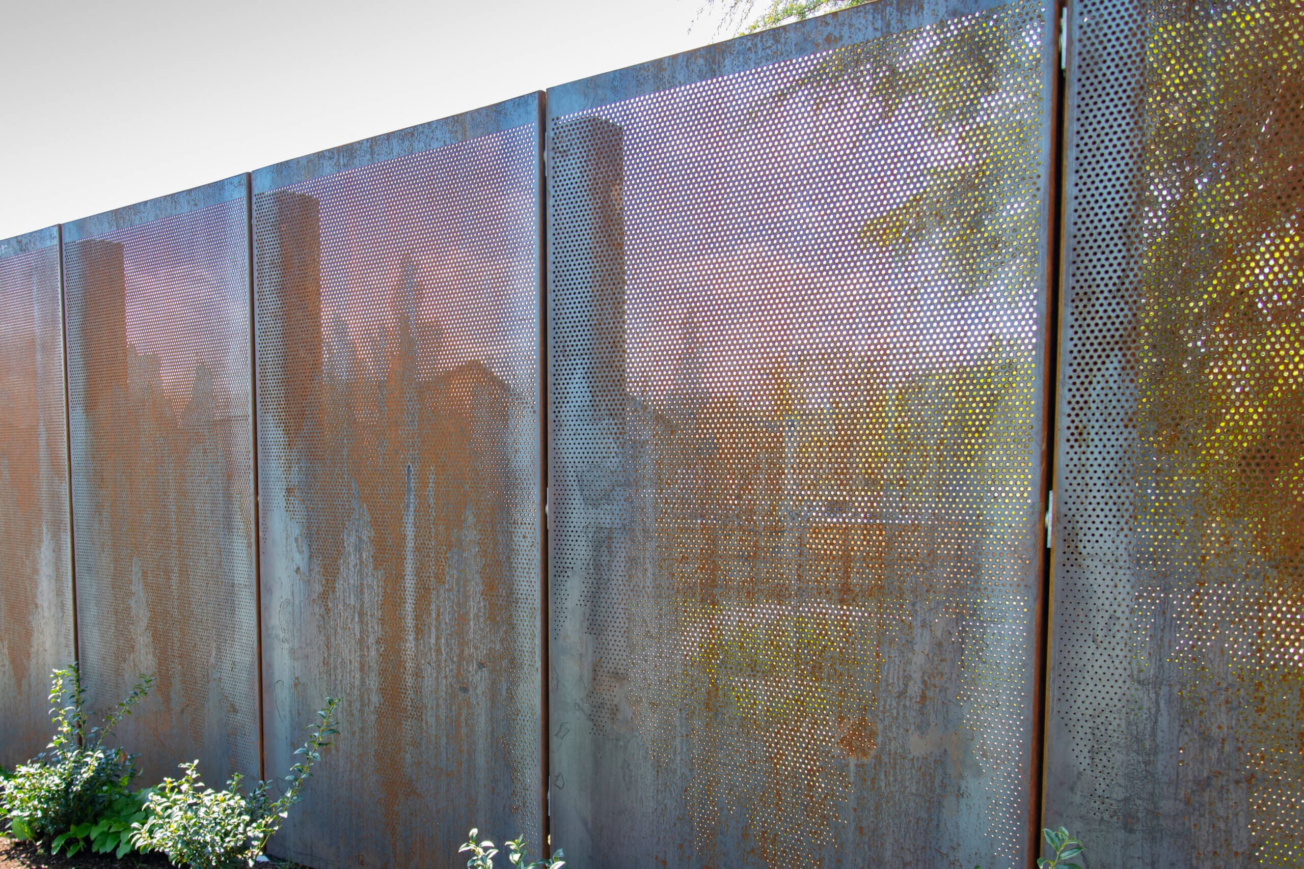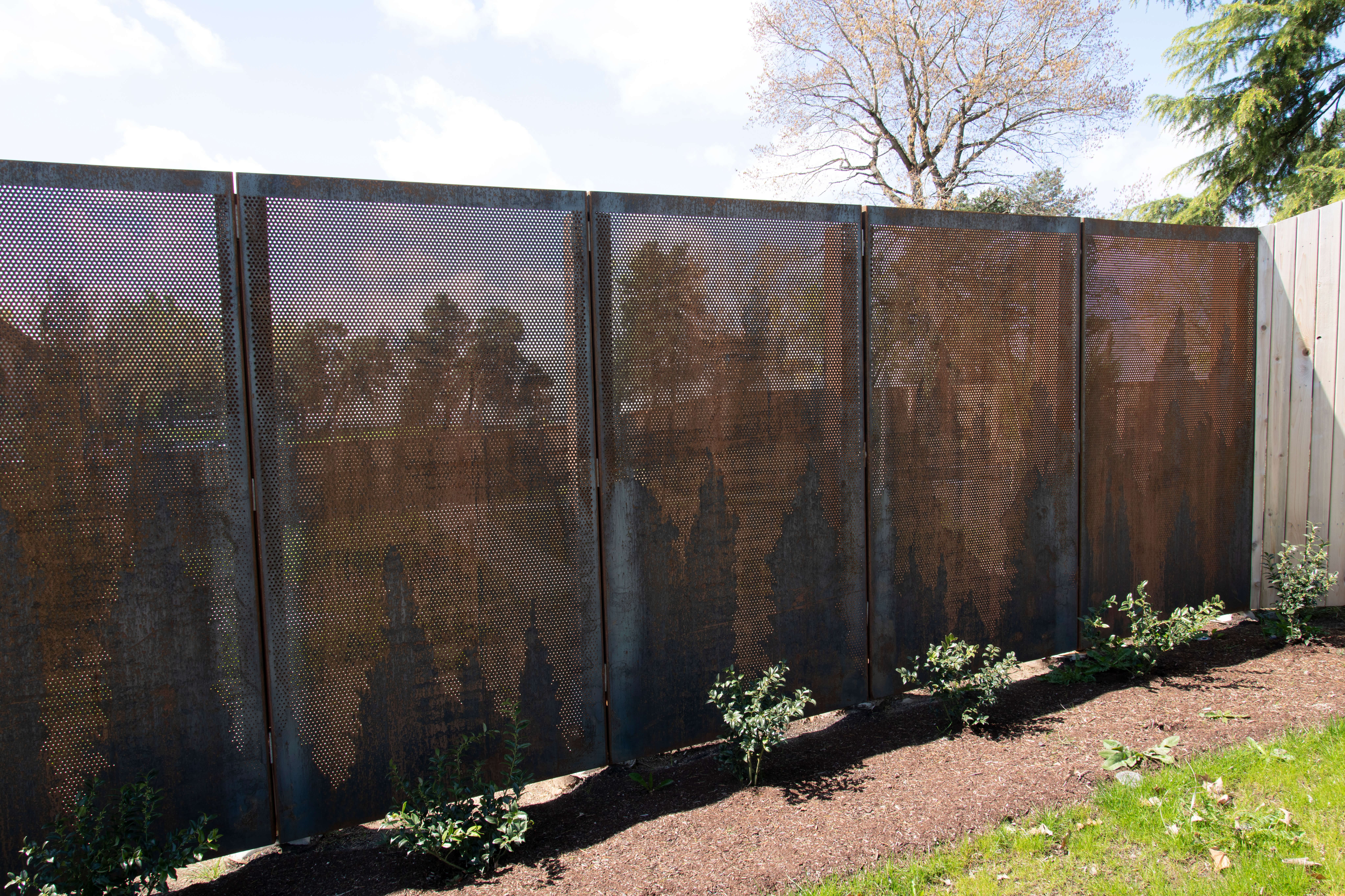 Designed to perfection, the custom perforated metal privacy panels consisted of four distinct designs featuring multiple round perforation diameters to create the captivating tree-line pattern. By meticulously incorporating 1/8 “, 3/16”, and 1/4” holes, Roy Manufacturing achieved a balance between privacy and aesthetics. A total of 69 panels were manufactured using 11 GA COR-TEN® sheets measuring 4’ x 8’. Each panel was carefully formed with flanges and mounting holes to facilitate easy installation.