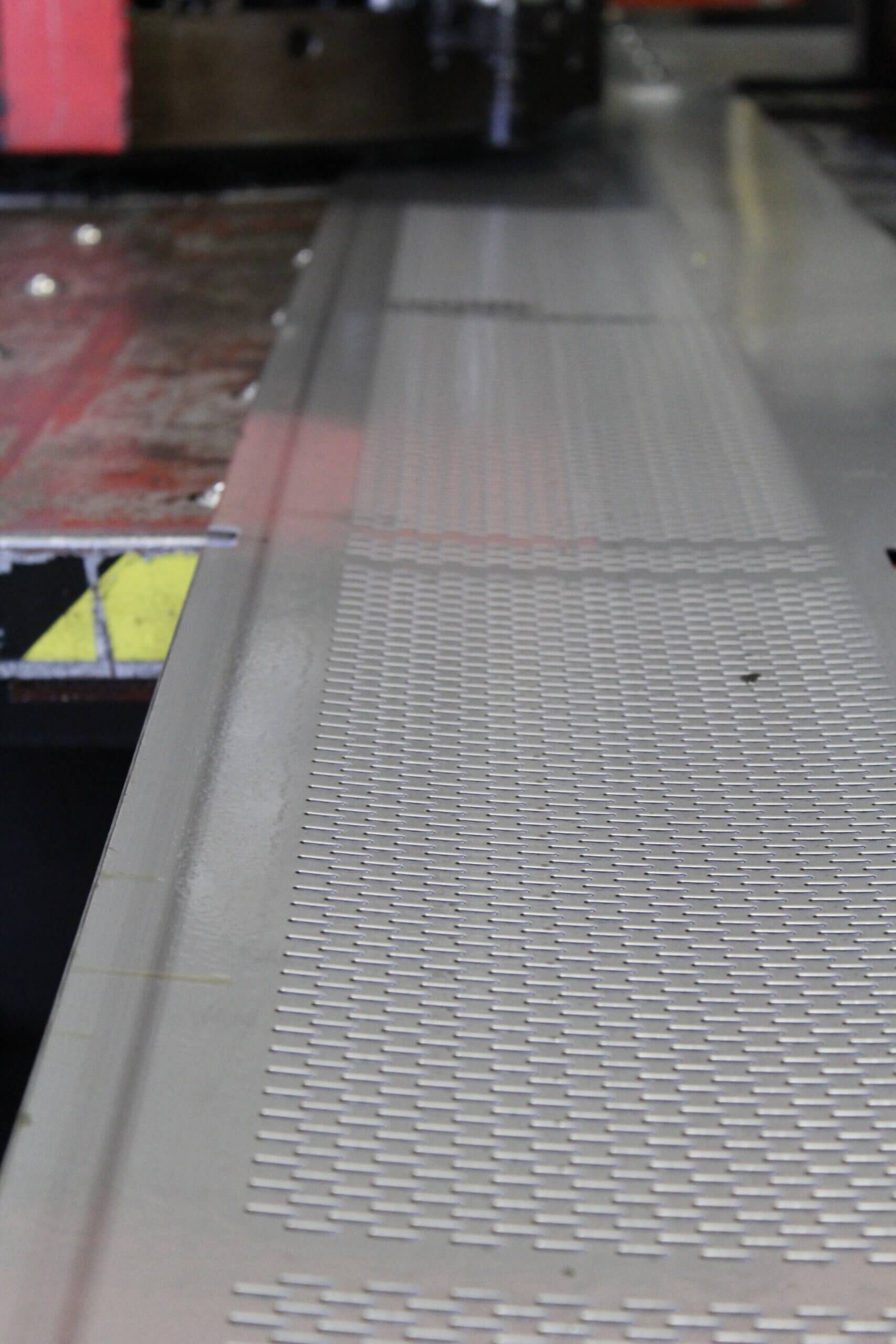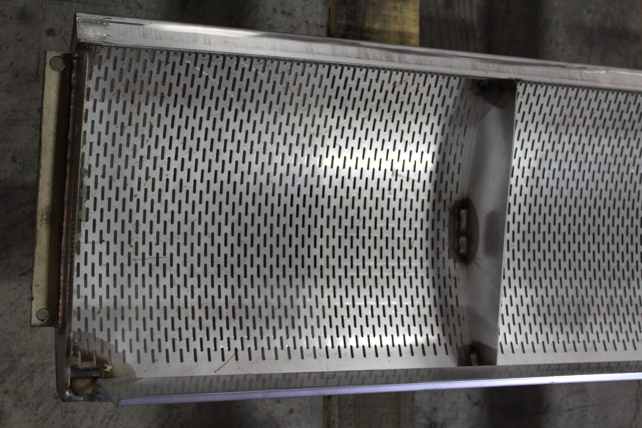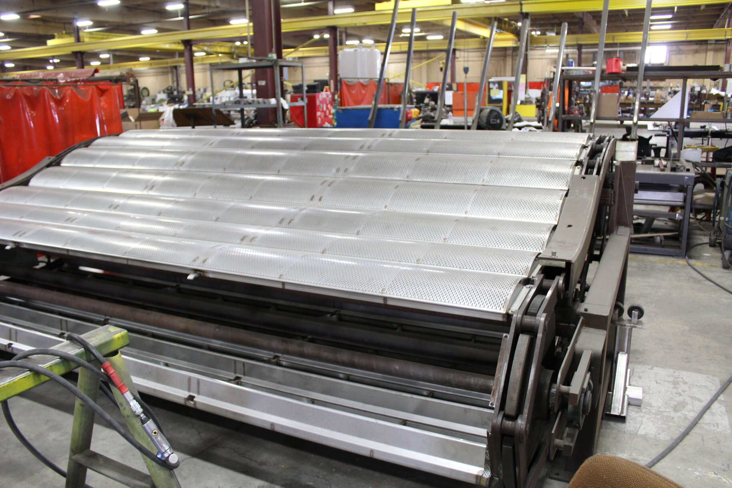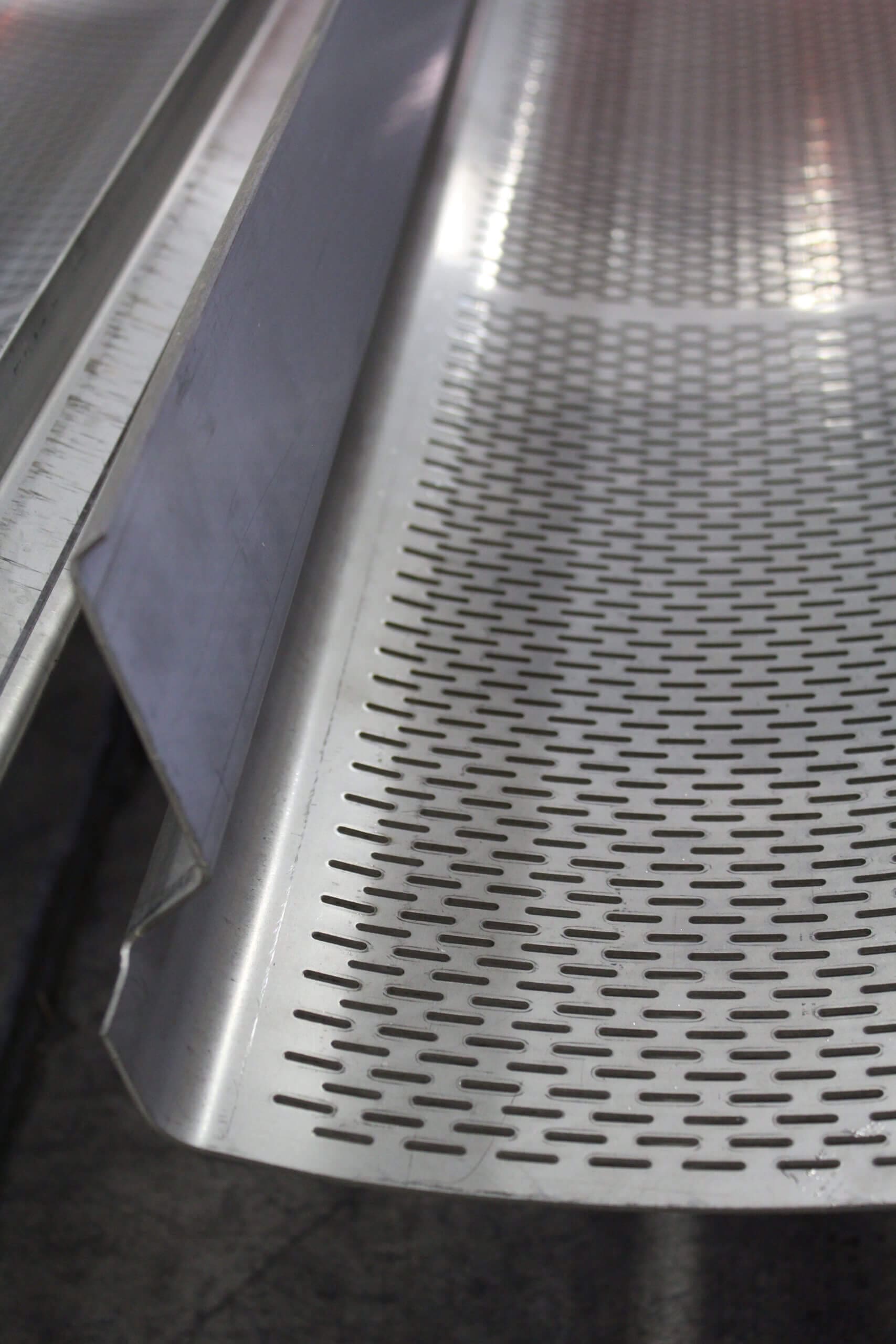 GEM Equipment frequently reorders punched metal sheets from Roy Manufacturing for installation in food processing equipment as part of an elevator that carries french fries up and out of a liquid bath. A total of 555 belts were produced from 14-gauge stainless steel: 300 sized 20.5 x 144” and 255 sized between 13 to 15 x 144”. Each sheet was punched with about 9000 obround/oblong holes sized 3/32 x 1/2”. A typical custom-punched metal industrial order is between 150 to 300 pieces, so we were excited to be selected for a project of this size!