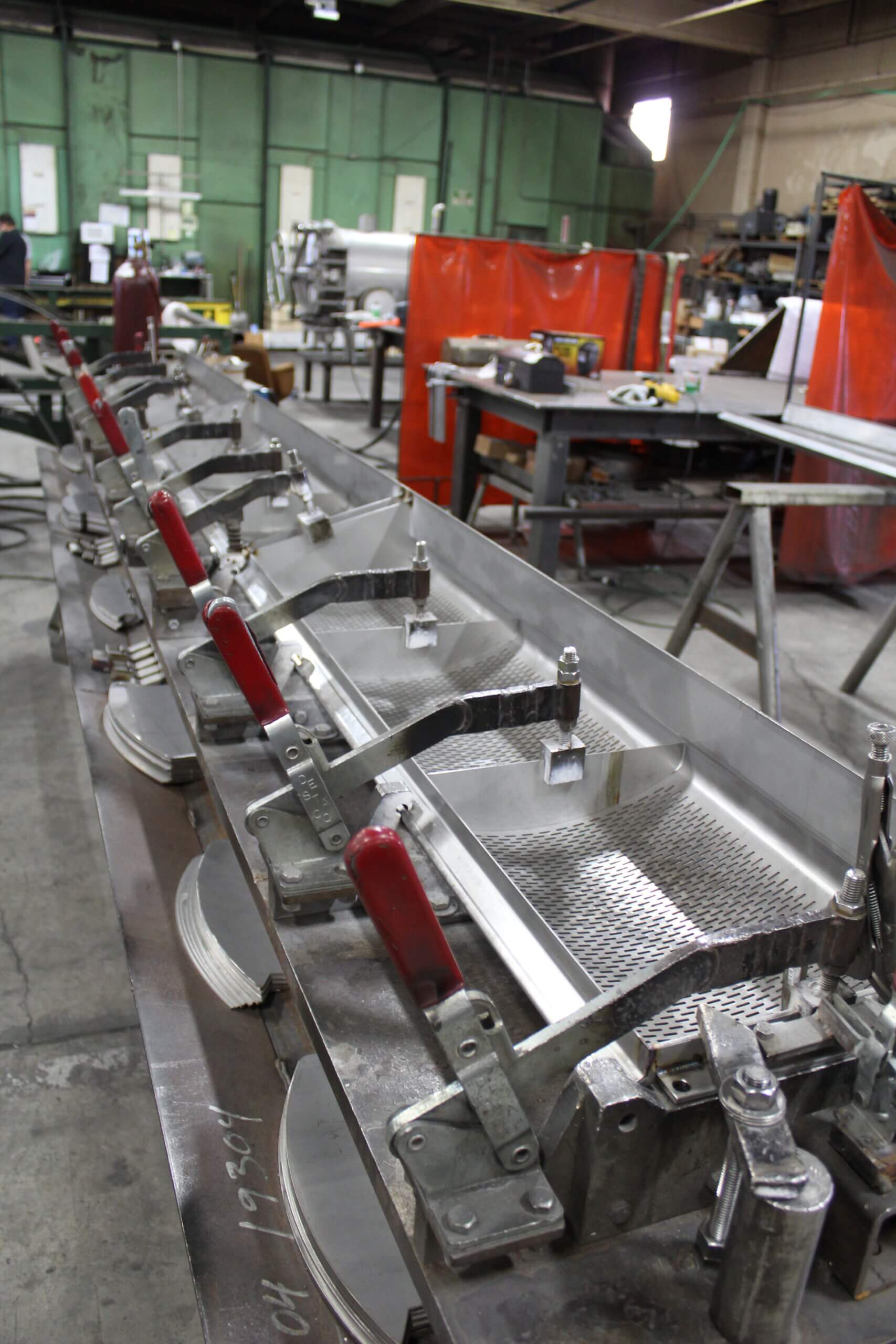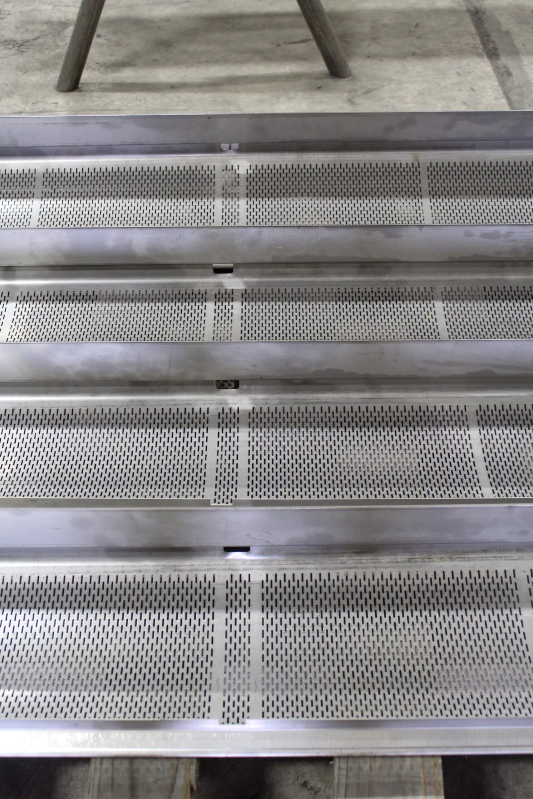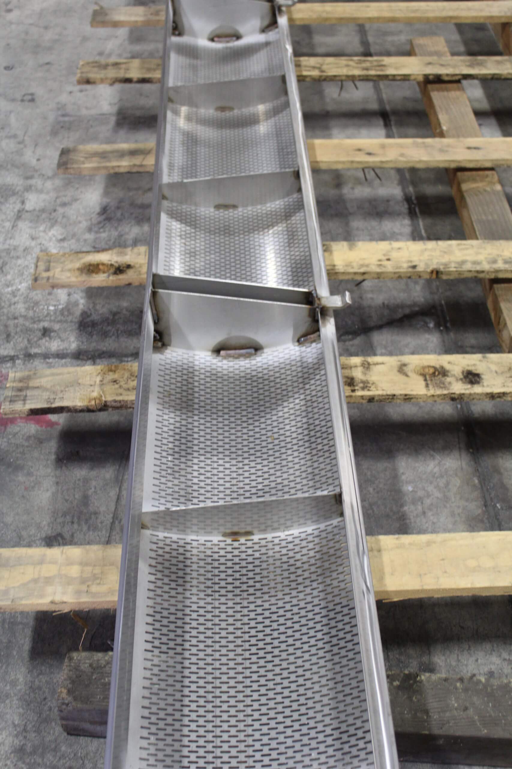 GEM Equipment frequently reorders punched metal sheets from Roy Manufacturing for installation in food processing equipment as part of an elevator that carries french fries up and out of a liquid bath. A total of 555 belts were produced from 14-gauge stainless steel: 300 sized 20.5 x 144” and 255 sized between 13 to 15 x 144”. Each sheet was punched with about 9000 obround/oblong holes sized 3/32 x 1/2”. A typical custom-punched metal industrial order is between 150 to 300 pieces, so we were excited to be selected for a project of this size!