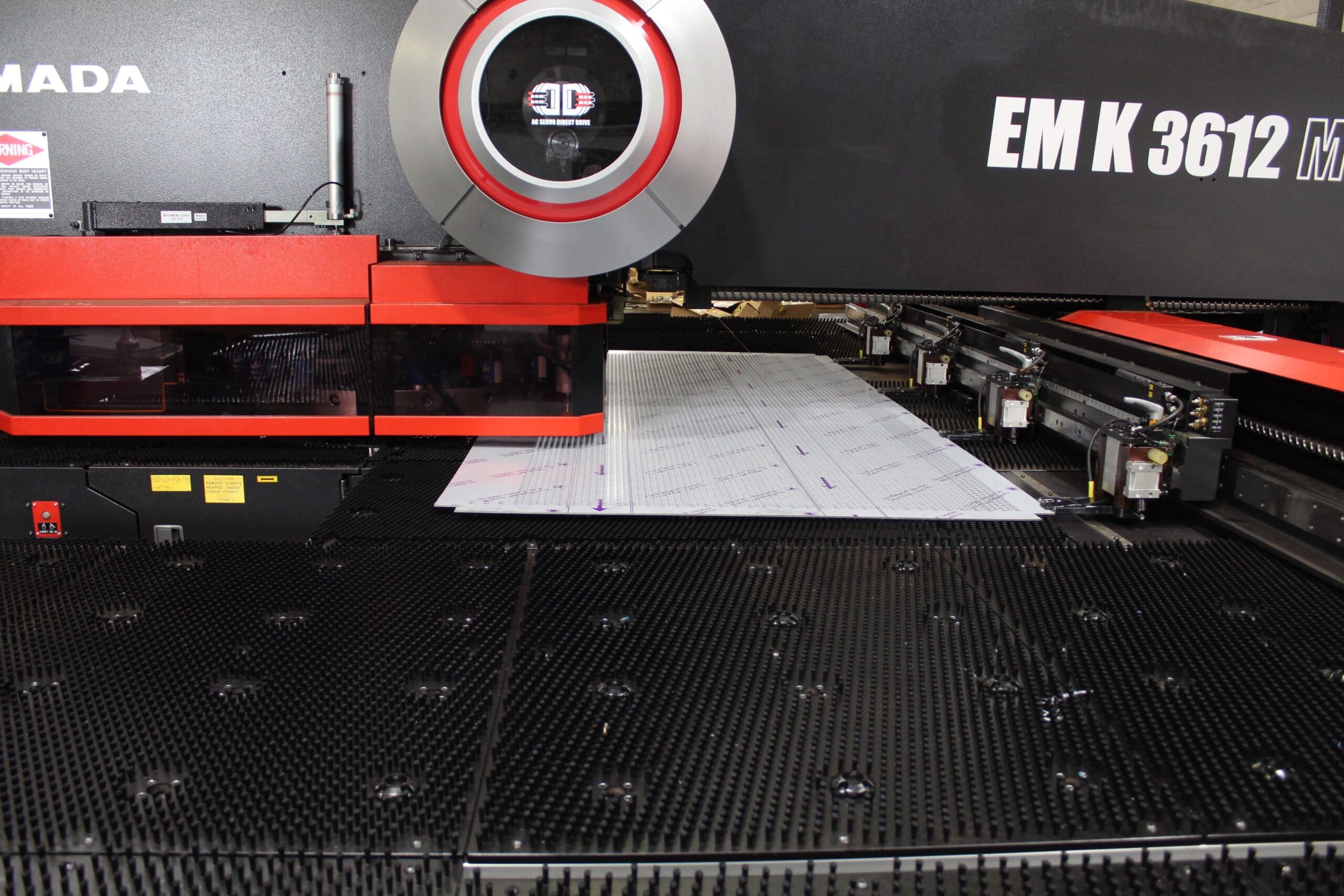 Our Amada EMK 3612 turret press optimized production efficiency without compromising on craftsmanship. This advanced machine allowed for precise perforations and nibbling, ensuring each panel met the project’s decorative standards promptly and accurately.