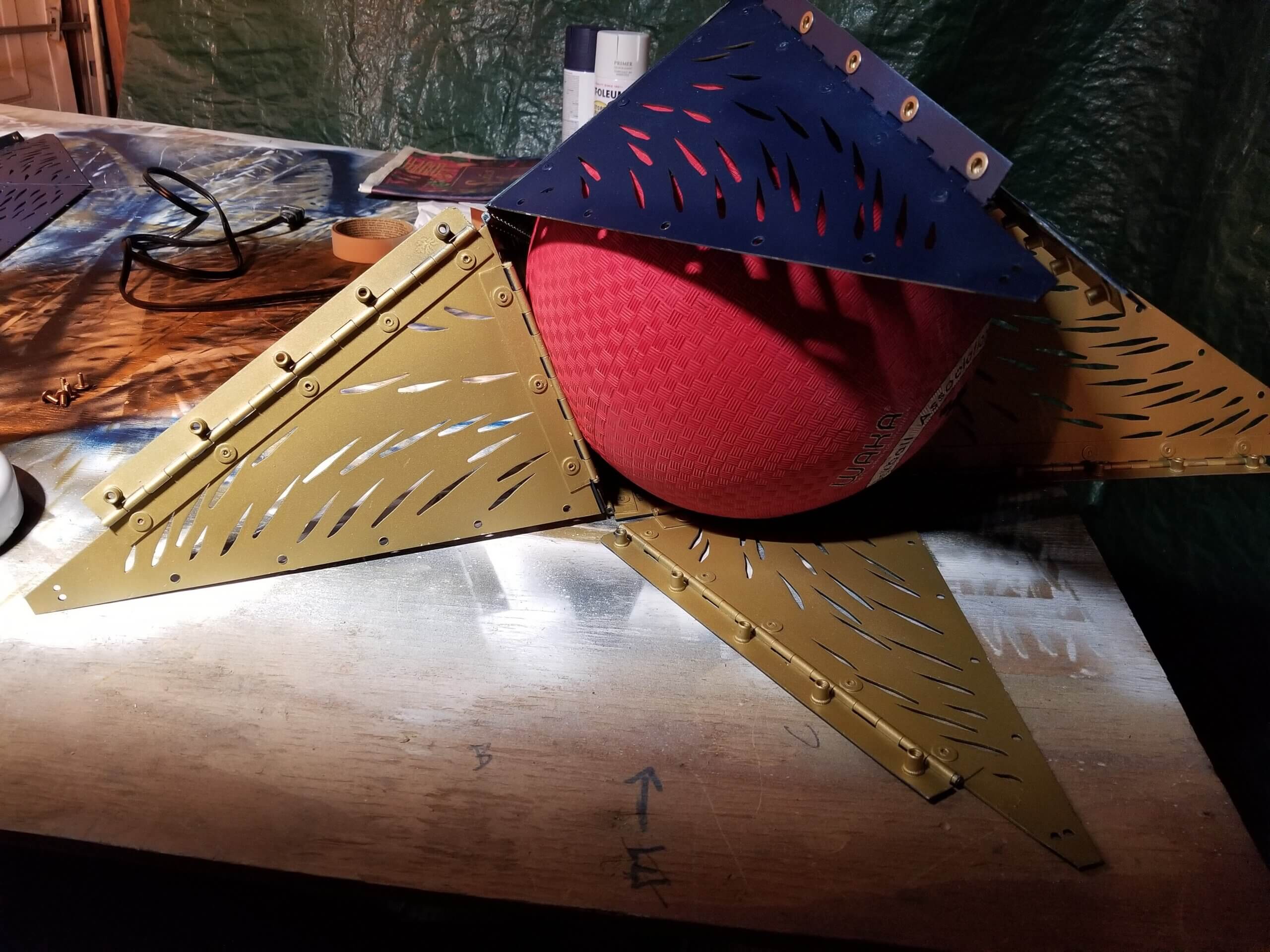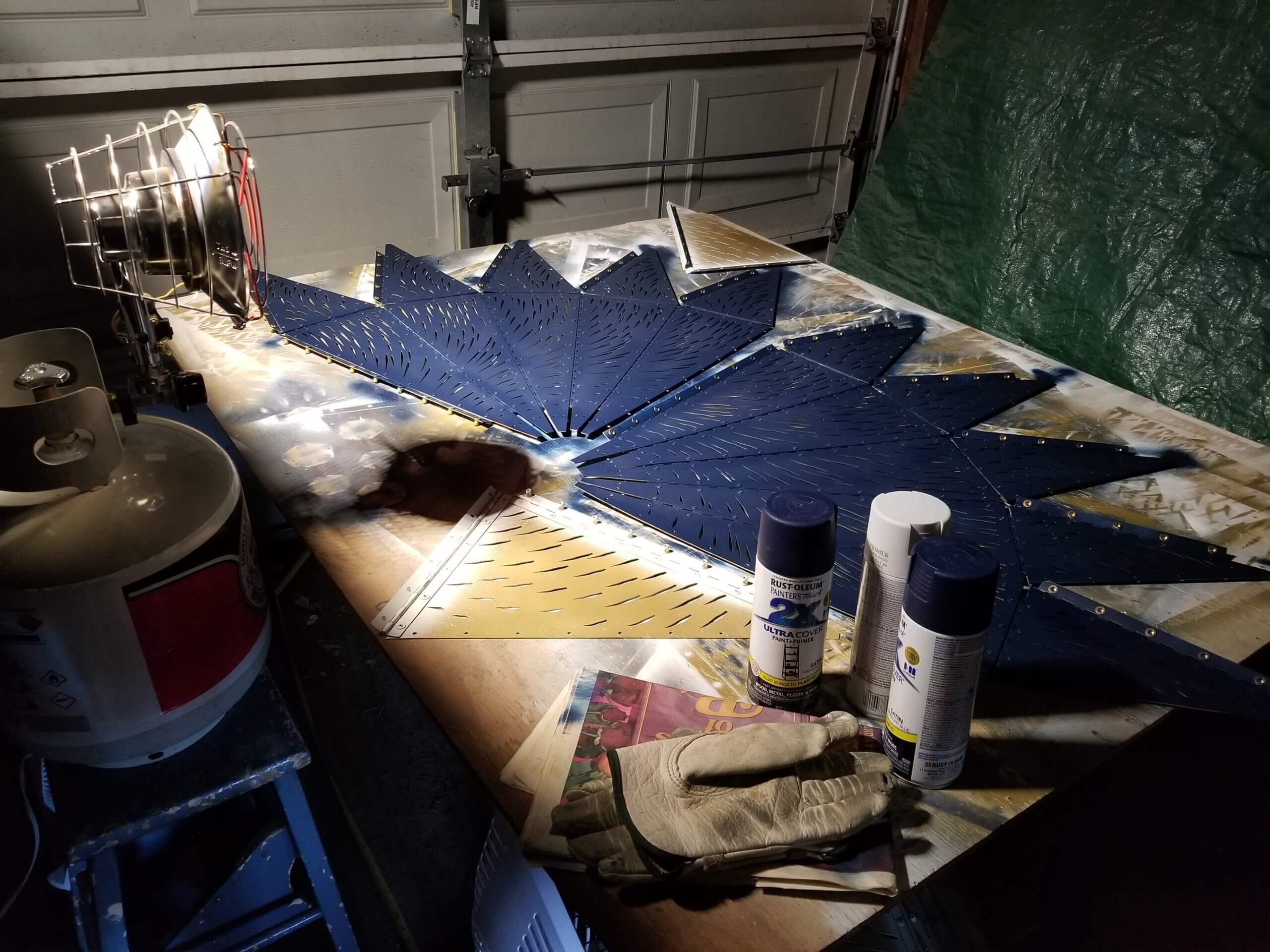 The collaboration extended beyond laser cutting, as Jean Margaret Thomas and her team skillfully assembled and finished the Swirl Lanterns. The diamond shapes of the lantern’s sides were designed to fold inwards, creating a distinctive droplet-like shape. Functional piano hinges allowed for smooth movement, while rivet nuts ensured secure closure. The top circle was closed using a rubber ball, maintaining the lantern’s form as the sides rolled over it to align the edges seamlessly. The interior of the lanterns was painted gold to create a striking contrast against the dark blue exterior, allowing the vector shapes to stand out when illuminated. The lanterns were strategically positioned to spin, allowing the light to glide across surfaces through the intricately shaped vector holes, mimicking the graceful flow of wind.